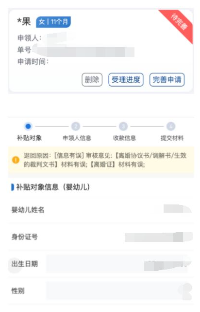 2、点击首页的[完善申请]按钮,或“进度”页面中的[完善申请]按钮,可以继续修改信息,最上方会显示退回原因,方便申领人修改对应信息。