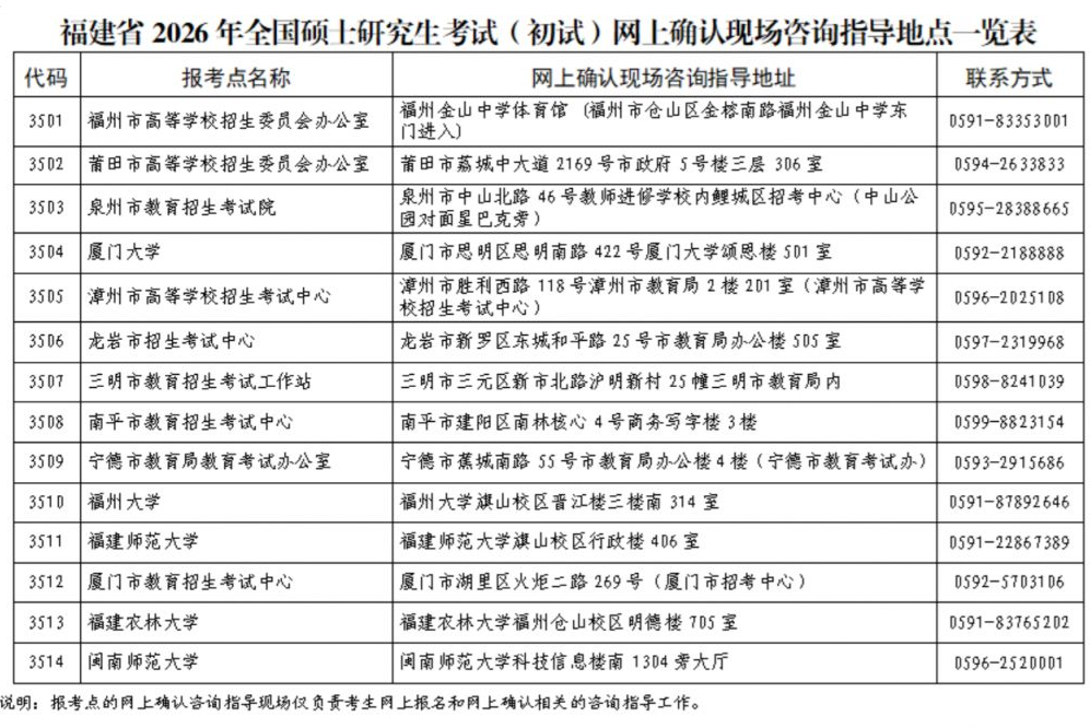 附件:福建省2026年全国硕士研究生考试(初试)网上确认现场咨询指导地点一览表