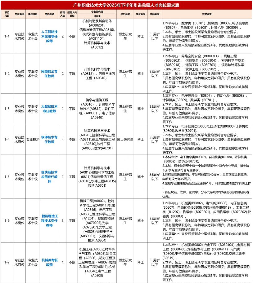 附件1 广州职业技术大学2025年下半年引进急需人才岗位需求表