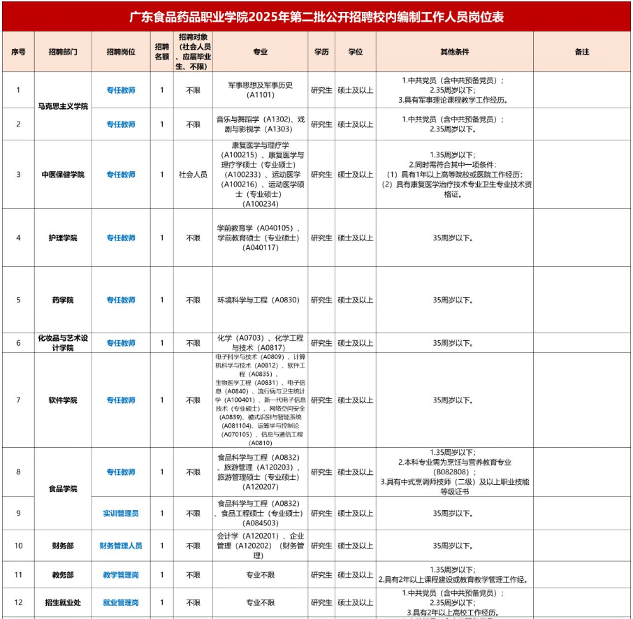 岗位信息及资格条件详见《广东食品药品职业学院2025年第二批招聘校内编制工作人员岗位表》(附件1)。