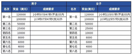1.破马拉松世界纪录(男子、女子),奖励10万美元(只奖励第一名)。