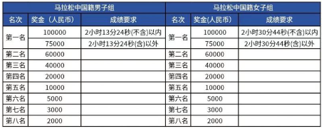 马拉松成绩达到如下成绩要求,并获得中国籍男子和女子前八名的选手(按净计时成绩),将分别获得奖金(人民币)。如果同时获得马拉松名次奖和马拉松中国籍参赛选手名次奖,按较高奖励标准发放,不重复发放奖金。