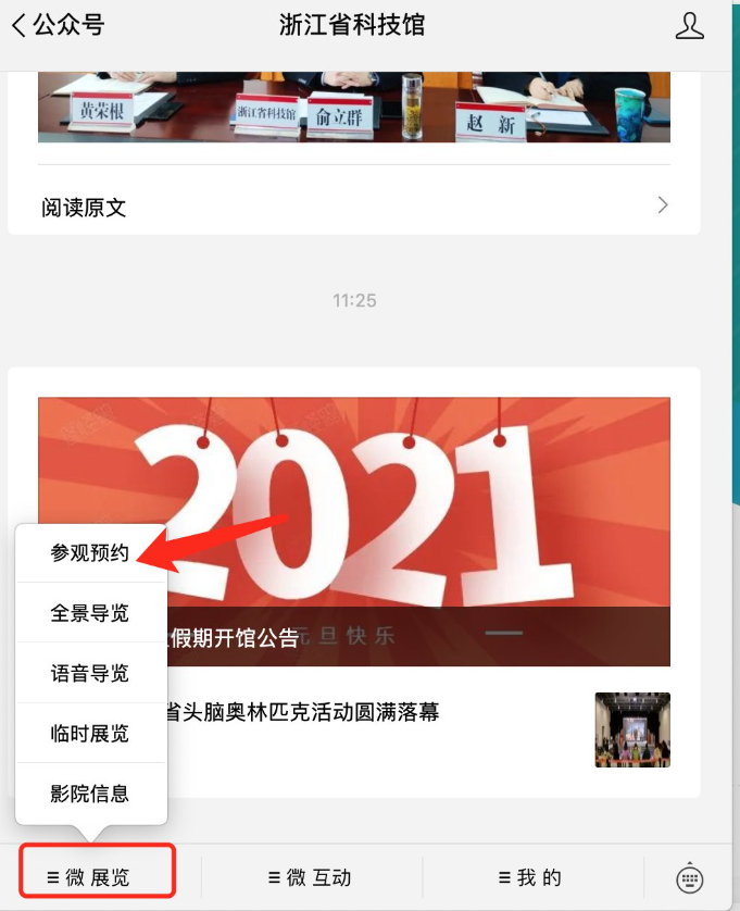 预约方式:关注“浙江省科技馆”官方公众号,进入后点击菜单栏中的“微 展览”-“参观预约”,即可进入到预约页面。