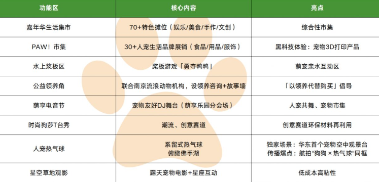 活动内容:以狗狗马拉松为核心,设置10大主题活动,30+携宠社交体验活动串联全程