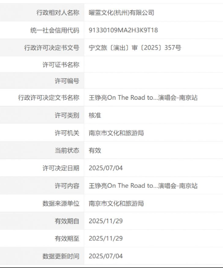 王铮亮On The Road to (在路上)演唱会-南京站已通过审批,更多信息后续将做持续更新。