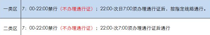 一类区,每日7:00-22:00禁行,晚间22:00-次日7:00须办理通行证后,按指定线路通行。