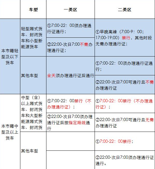 一类区,从事城市配送的厢式货车、封闭货车和小型新能源货车每日7:00-22:00须办理通行证后通行;其他车型全天须办理通行证后通行。