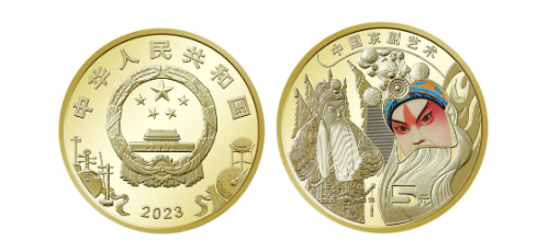中国京剧艺术普通纪念币正面主图案为中华人民共和国国徽,国徽上方刊“中华人民共和国”国名,下方刊年号“2023”字样,辅以中国戏曲乐器图案;背面主图案为中国京剧艺术中生角形象,局部为彩色图案,辅以装饰化图形,并刊“中国京剧艺术”及面额“5元”字样。