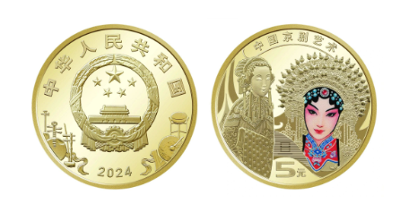 中国京剧艺术普通纪念币正面主图案为中华人民共和国国徽,国徽上方刊“中华人民共和国”国名,下方刊年号“2024”字样,辅以中国戏曲乐器图案;背面主图案为中国京剧艺术中旦角形象,局部为彩色图案,辅以装饰化图形,并刊“中国京剧艺术”及面额“5元”字样。
