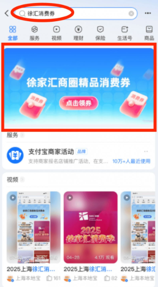 1.用户在消费券发放时间点打开支付宝,如在支付宝首页看到活动入口,点击即可。或在支付宝首页搜索“徐汇消费券”或者“徐家汇商圈精品消费券”,即可进入活动页面。