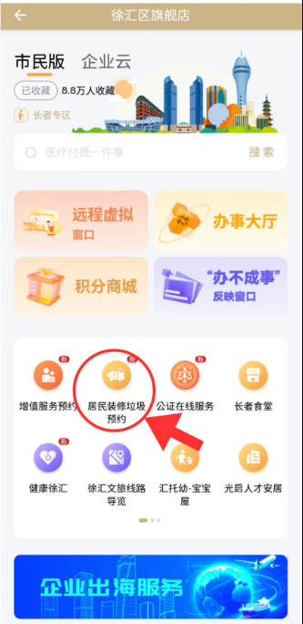 进入徐汇旗舰店主页,点击“居民装修垃圾预约”。