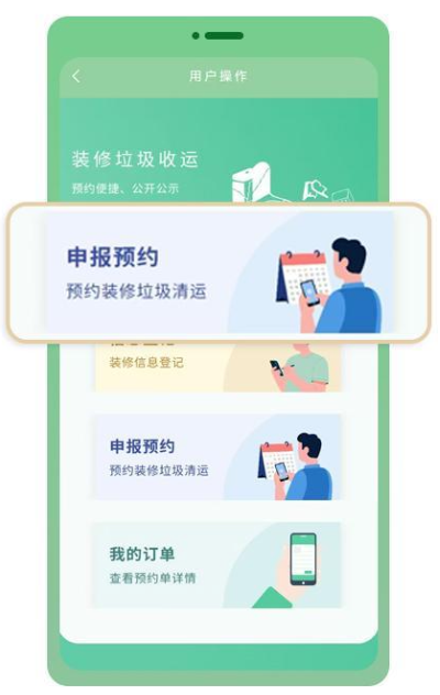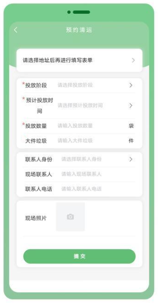 进入装修垃圾收运主页,点击“申报预约”,进入预约清运页面,选择备案地址,填写相关信息,确认无误后点击“提交”。