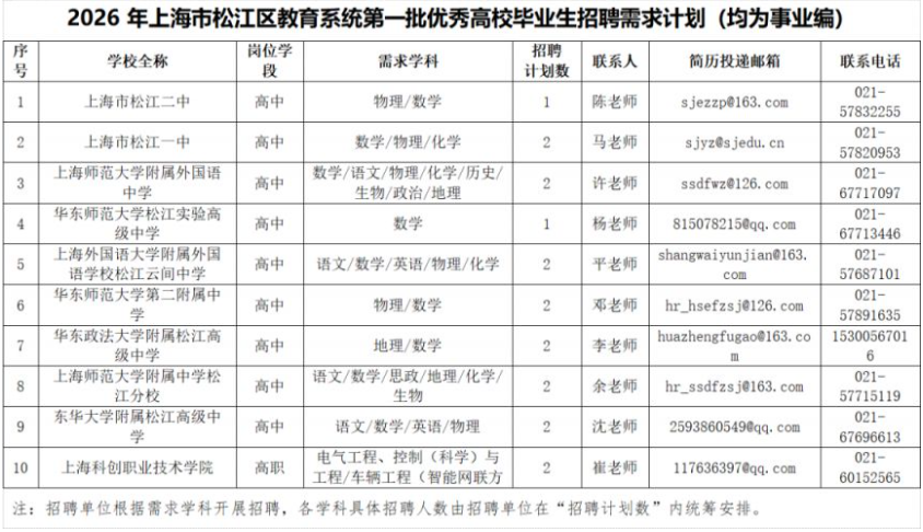 - 1松江区教育系统2026年第一批优秀高校毕业生招聘公告