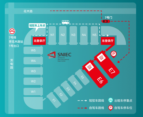 上海新国际博览中心(SNIEC)坐落于上海浦东经济与工业核心发展区。地铁7号线可直达SNIEC,其花木路站紧邻上海新国际博览中心W5号展厅。此外, 大型交通枢纽中心—龙阳路站(位于龙阳路上) 距离SNIEC仅600余米,地铁2号线、地铁7号线、以及多条公交线路交汇于此,由龙阳路站步行10分钟,即可抵达。
