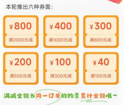 第一轮推出满2000减800、满1000减400、满800减300、满500减200、满300减100满100减40六类。