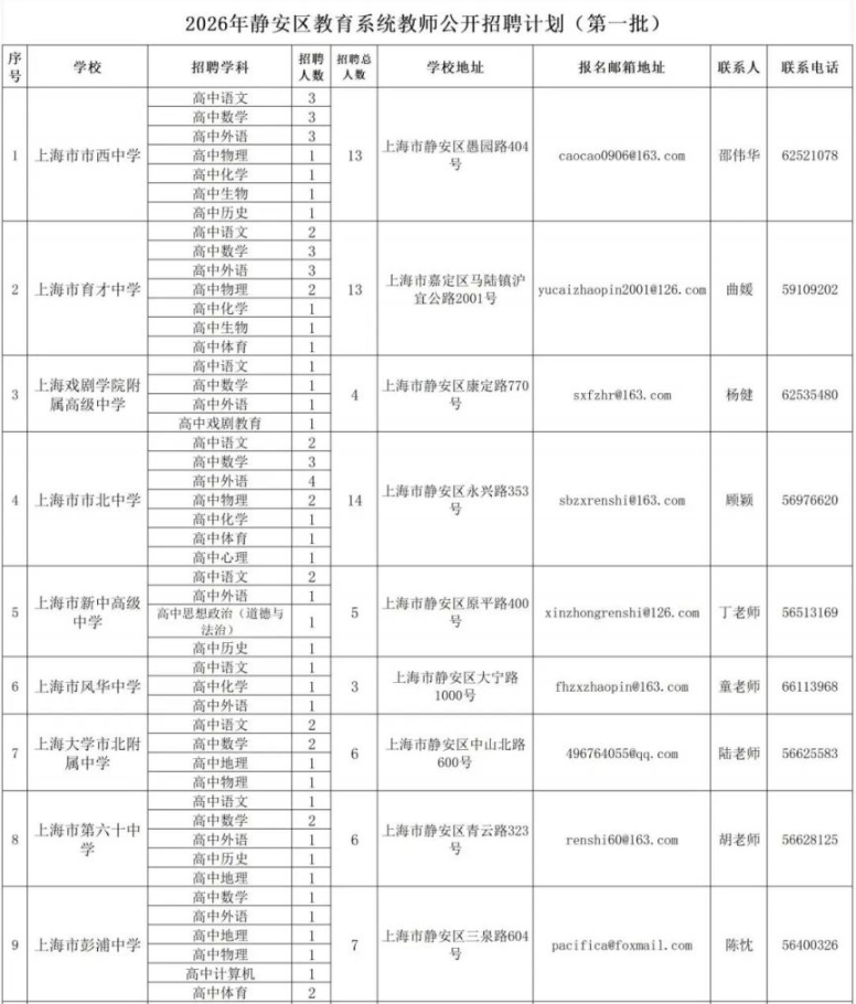 - 42026年上海静安区教育系统第一批公开招聘教师通告