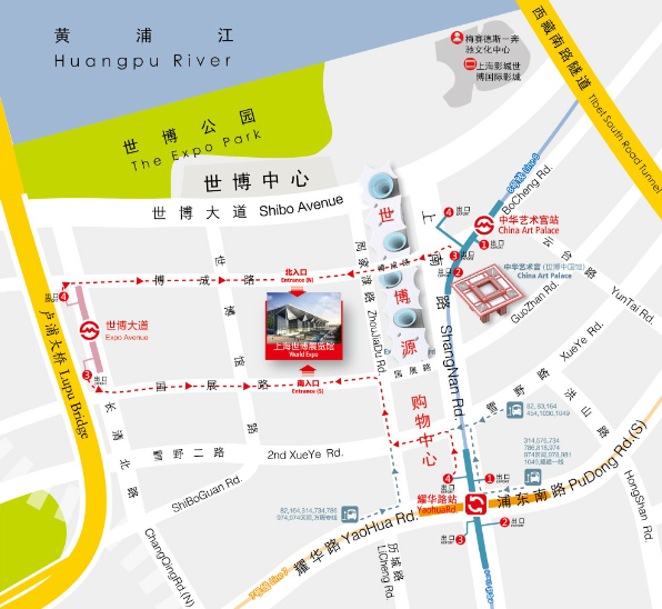 北入口:地铁8号线中华艺术宫站4号出口;13号线世博大道站4号出口