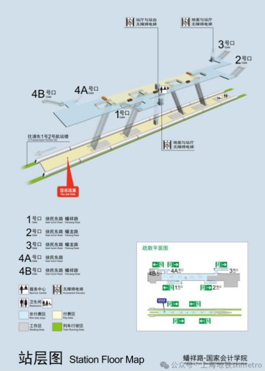 车站设施方面,蟠祥路·国家会计学院站同步开通1号口、2号口、3号口和4号口(4A、4B号口),共4个出入口。同时,为了方便乘客通行,车站安装了3台无障碍电梯。其中,1台站厅至站台的无障碍电梯位于付费区内,2台地面至站厅的无障碍电梯分别位于非付费区靠近1号、3号出入口处。此外,车站公共卫生间(含无障碍厕所)位于站台层,为乘客提供良好的服务体验。