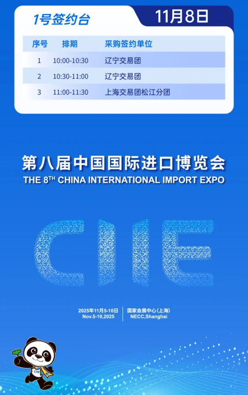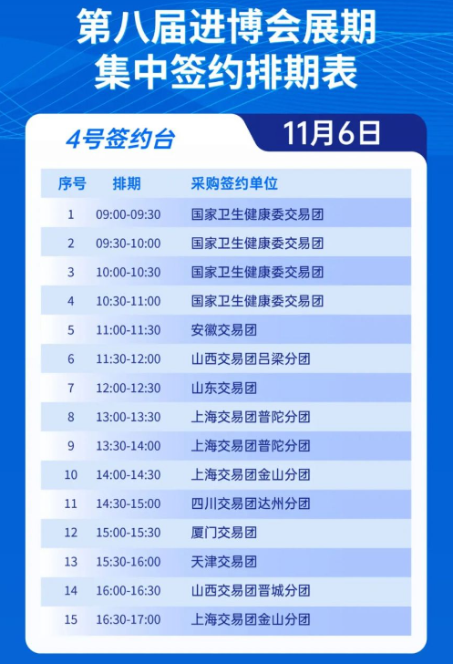 2025年11月6日至8日期间,在1.1号馆的交易团集中签约区,将有近80档集中签约活动轮番举办。中央企业、国家卫生健康委和相关地方交易团的近200家采购商将与第八届进博会参展商集中签约,预计达成意向合作近600项。