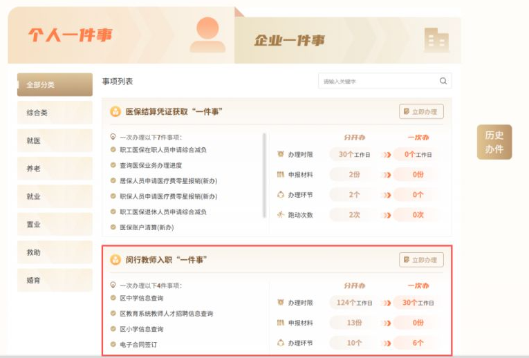 01点击网址,进入“闵行区一件事”首页,点击“闵行教师入职”一件事。