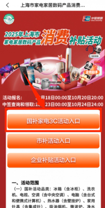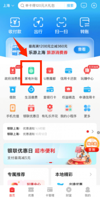 第一步:打开【云闪付App】,点击【家电补贴】进入活动页面;