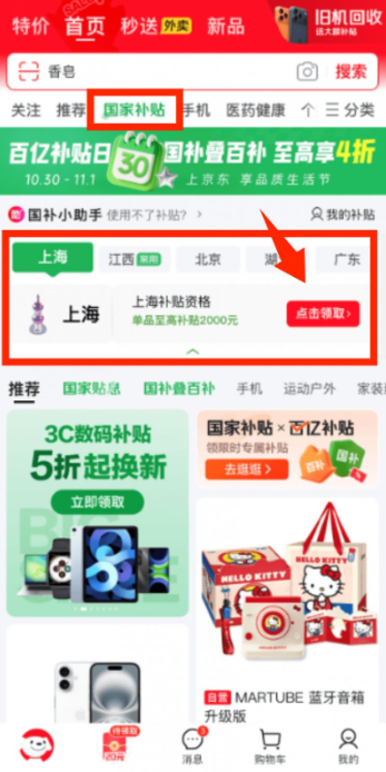 第一步:打开京东App,点击【国家补贴】,下方【上海补贴资格】,点击【点击领取】;