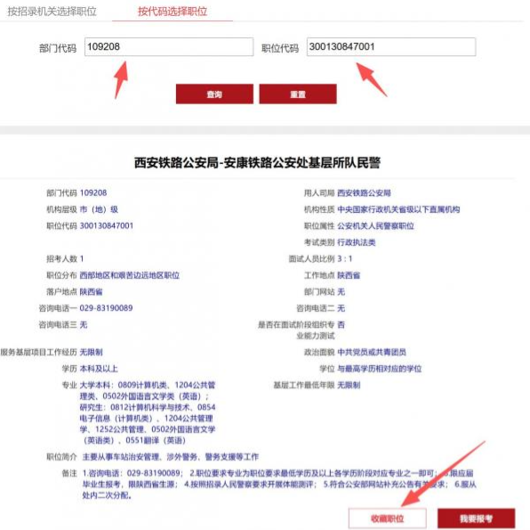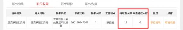 (1)通过“职位收藏”页面查看。进入“个人中心”页面点击“职位查询”后,点击需查看职位的“职位说明”,点击下方“收藏职位”按钮,点击确定后,即可在“个人中心”的“职位收藏”页面中查看所选职位的待审查人数和审核通过人数。