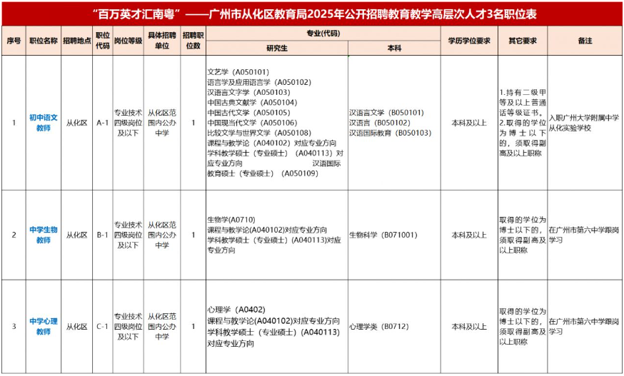 附件:1.“百万英才汇南粤”——广州市从化区教育局2025年公开招聘教育教学高层次人才3名职位表