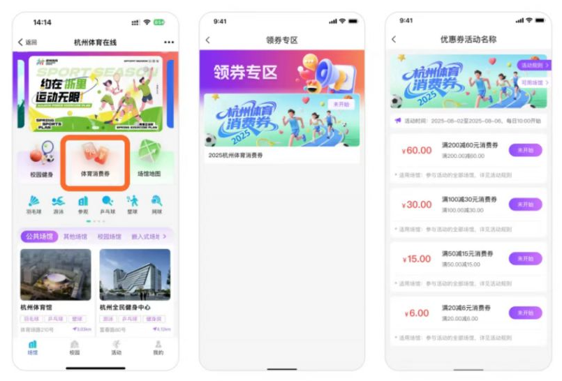浙里办/市民卡APP“杭州体育在线”应用。活动期间,用户可通过弹窗或腰部消费券专区进入领券页,市民卡APP用户还可通过首页广告入口领取优惠券。