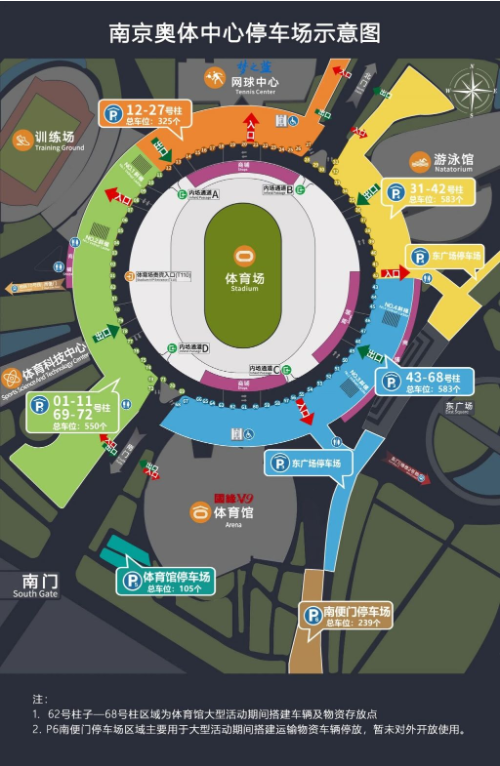 南京站乘坐地铁3号线->大行宫站换乘地铁2号线->奥体东站,约48分钟