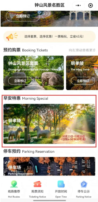 微信搜索“钟山风景区”小程序,直接购买“明孝陵景区早安特惠票”,享受明孝陵景区半价优惠35元/人(原价70元/人)。