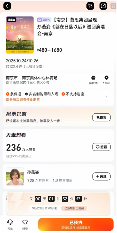 孙燕姿2025南京演唱会购票官网入口分享三次开票时间:10月21日12:00购票场次:10月24日/10月26日门票价格:看台480/680/880/......