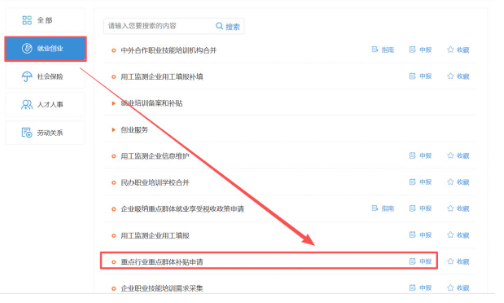 ③点击法人服务“就业创业”模块,找到“重点行业重点群体补贴申请”,点击“申报”,进行申报。