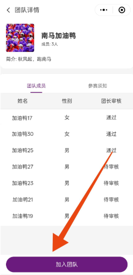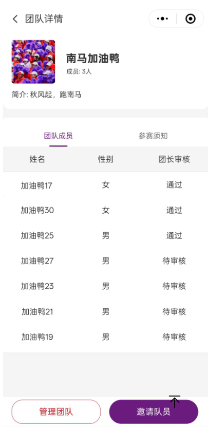 团长可以对进入团队的选手进行身份审核,审核通过方视为正式加入团队,确认后不可更改成员。当正式成员满足①总人数=15人②女性选手≥4人时,即组团成功。