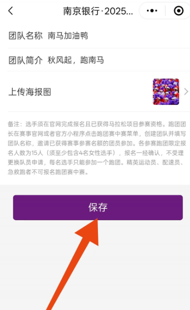 已获得2025南马【马拉松项目】参赛名额的选手,均可在「参赛助手」小程序南马首页的「跑团赛中赛」中创建自己的团队。