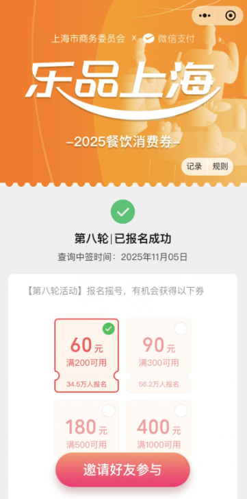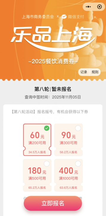 2025“乐品上海”餐饮消费券11月报名时间为11月1日-11月3日,微信渠道报名入口及流程如下。