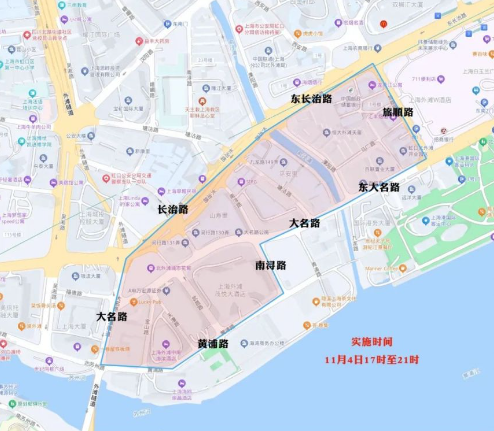 (一)11月4日17时至21时,大名路(含)—长治路(不含)—东长治路(不含)—旅顺路(不含)—东大名路(含)—大名路(含)—南浔路(含)—黄浦路(含)所合围的区域内,禁止一切车辆及行人通行。