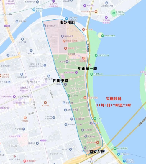 (二)11月4日17时至21时,南苏州路—中山东一路—延安东路—四川中路(含上述道路)所合围的区域内,禁止一切车辆通行。