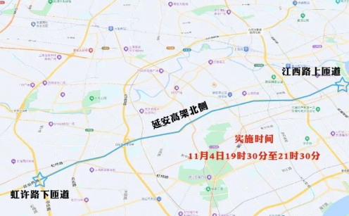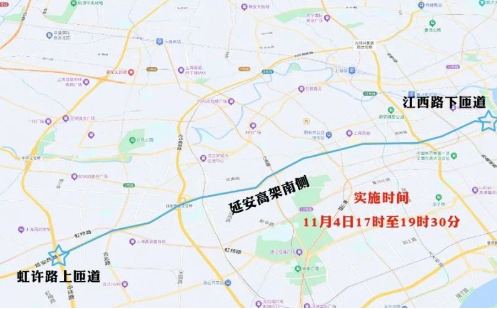 (五)11月4日17时至19时30分,延安高架南侧(虹许路上匝道至江西路下匝道),禁止机动车通行;